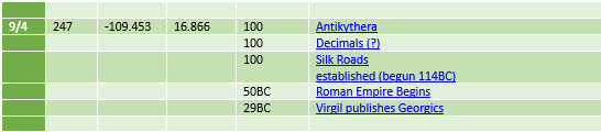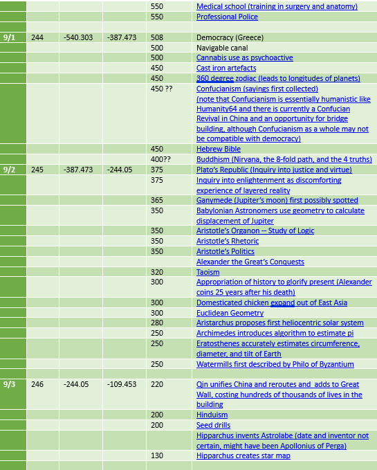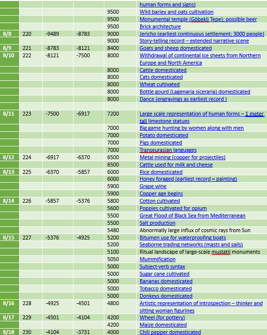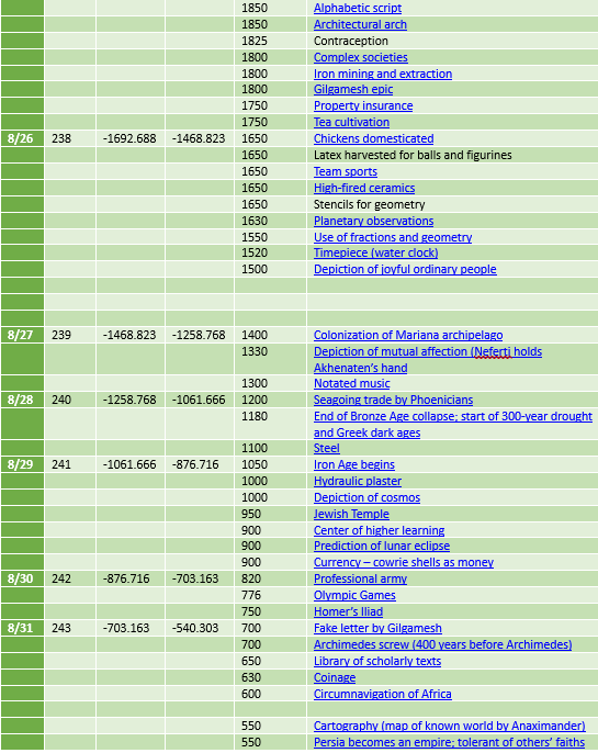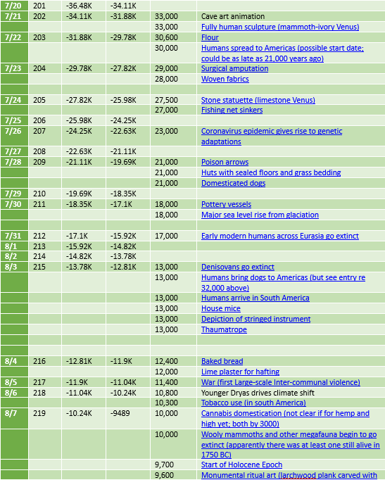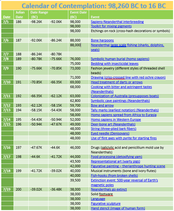 Here is the current draft of the segment of the Calendar that covers about 100,000 BC to 1 BC, and maps onto July 5 to September 4. If any reader of this post feels like making a video about any event on the calendar (or any other event in the history of the Universe), go for it! (And please let us know, so that we can promote it.)