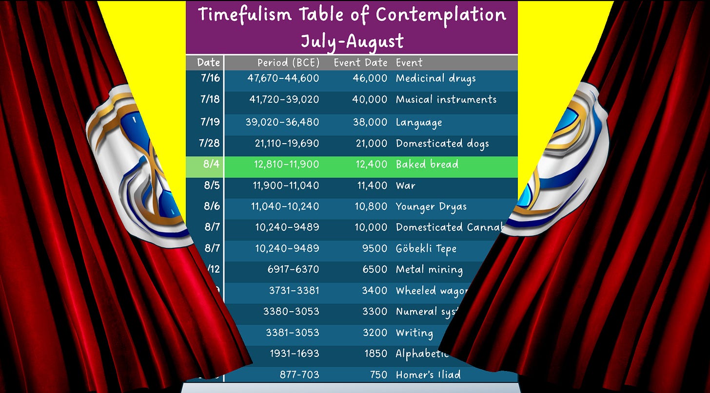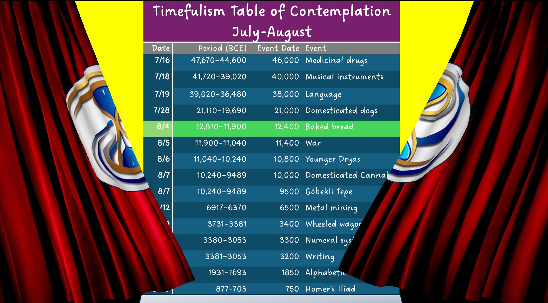 Our Calendar of Contemplation gives a pretty good sense of what some of Timefulism’s holidays could be. Of course, some of the dates will shift as new geological, archaeological, and/or historical findings are made, but as with everything else in this religion, nothing is set in stone. The segment of the Calendar of Contemplation that covers 100,000 BC to 1 BC, and maps to July 5 to September 4, is reproduced at the end of this newsletter.
