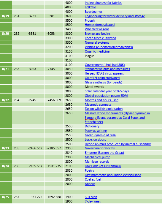 As of this writing (Saturdday August 17), there are many important upcoming days of contemplation. On Monday we can celebrate the invention of the plough and wheeled wagons, as well as the domestication of horses. On Tuesday we can celebrate the invention of writing and numeral systems, as well as organic drugs. On Thursday, we can think about the construction of Stonehenge and the Great Pyramid of Giza.
